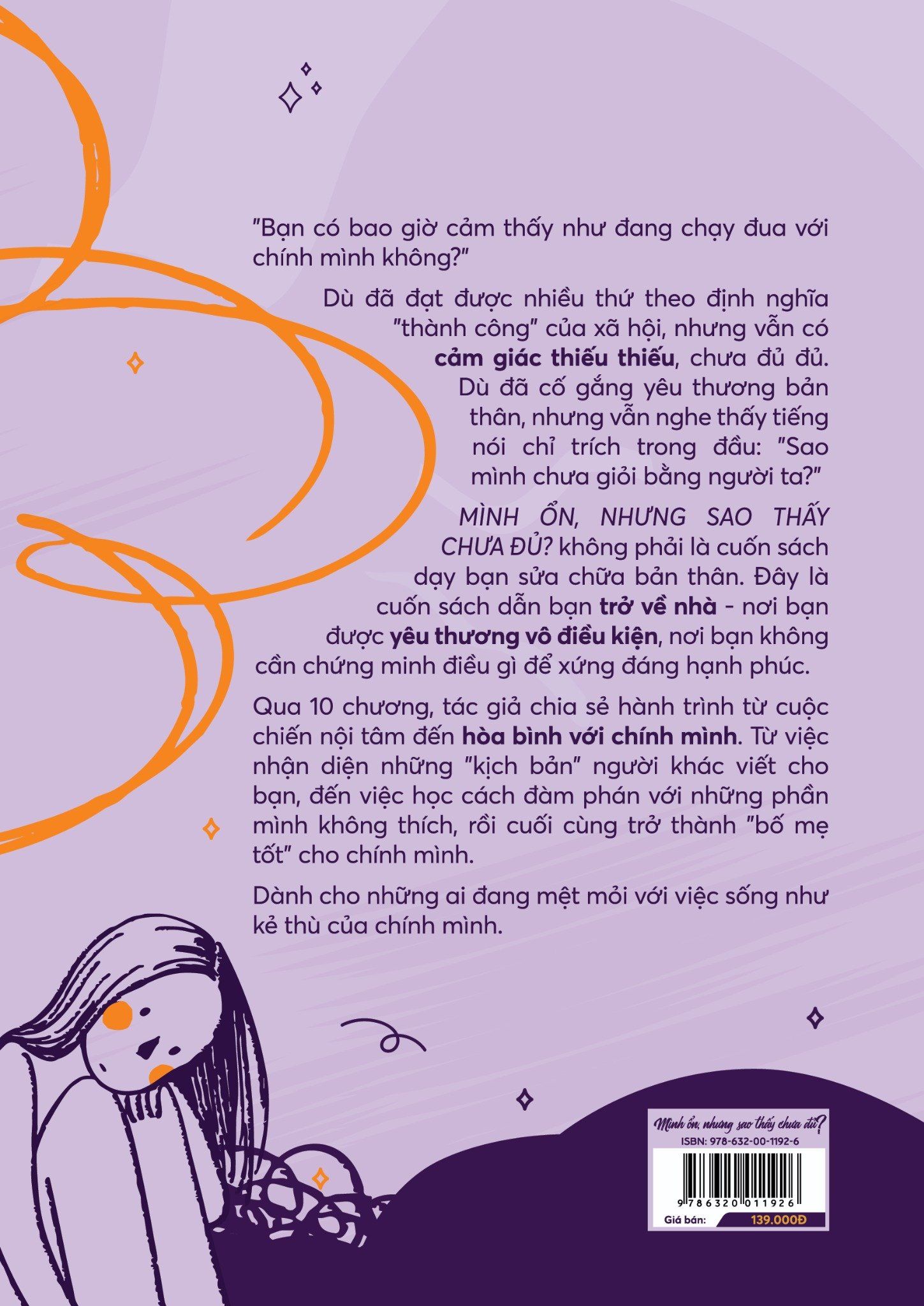 Cuốn sách Mình ổn, nhưng sao thấy chưa đủ? bắt đầu từ trạng thái rất phổ biến ấy, khi ta “ổn” trên bề mặt, nhưng bên trong lại âm thầm cảm thấy thiếu một điều gì đó.